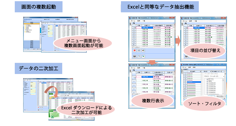 コピー、Excel貼り付け、フィルタ、ソートなど現場のニーズに耐える画面インタフェースを提供。 画面レイアウトはユーザ単位で自由に変更、保存することが可能。