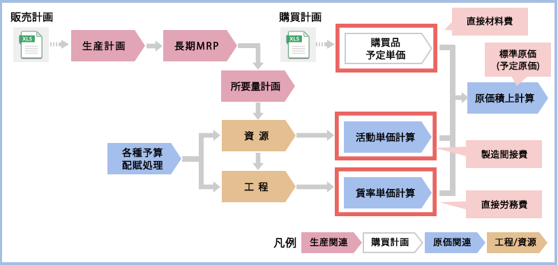 標準原価(予定原価)計算機能により、見積、予算策定、原価シミュレーションに活用することができます。