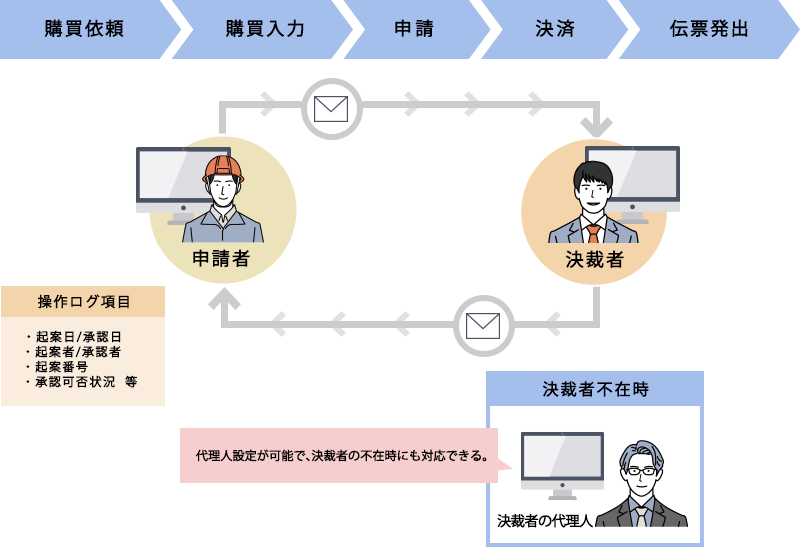 「BIZXIM化学」では内部統制機能として、業務の主要なポイントにおいて、承認機能を実装。 担当者の起案情報を上長に対して自動でメールでお知らせし、上長は承認/否認を行い担当者に対して理由を添えてメールでフィードバックします。