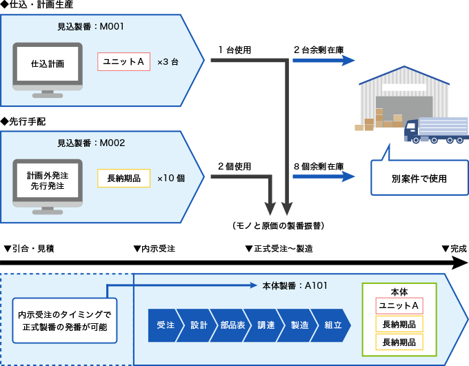 先行手配用の製番を発番し先行手配することが可能です。また、その先行手配品を本製番に振替える事も可能です。