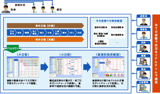 一連のフェーズ(引合~受注~設計~製造~出荷~工事~請求~完工~回収)における日程進捗予実情報を一気通貫で管理することで、大日程から詳細レベルまで、全社的な情報の共有が可能です。