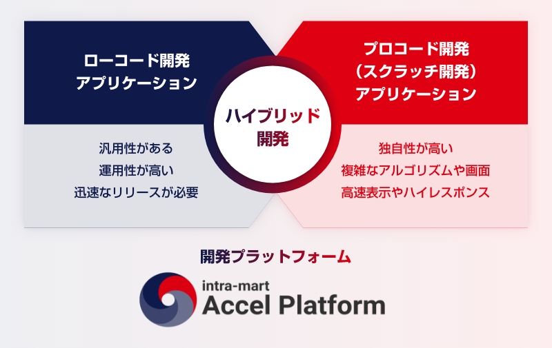 ローコード開発、プロコード開発(スクラッチ開発)のいずれも可能なintra-mart上において、システム要件や仕様特性に応じたお客様のハイブリッド開発を支援
