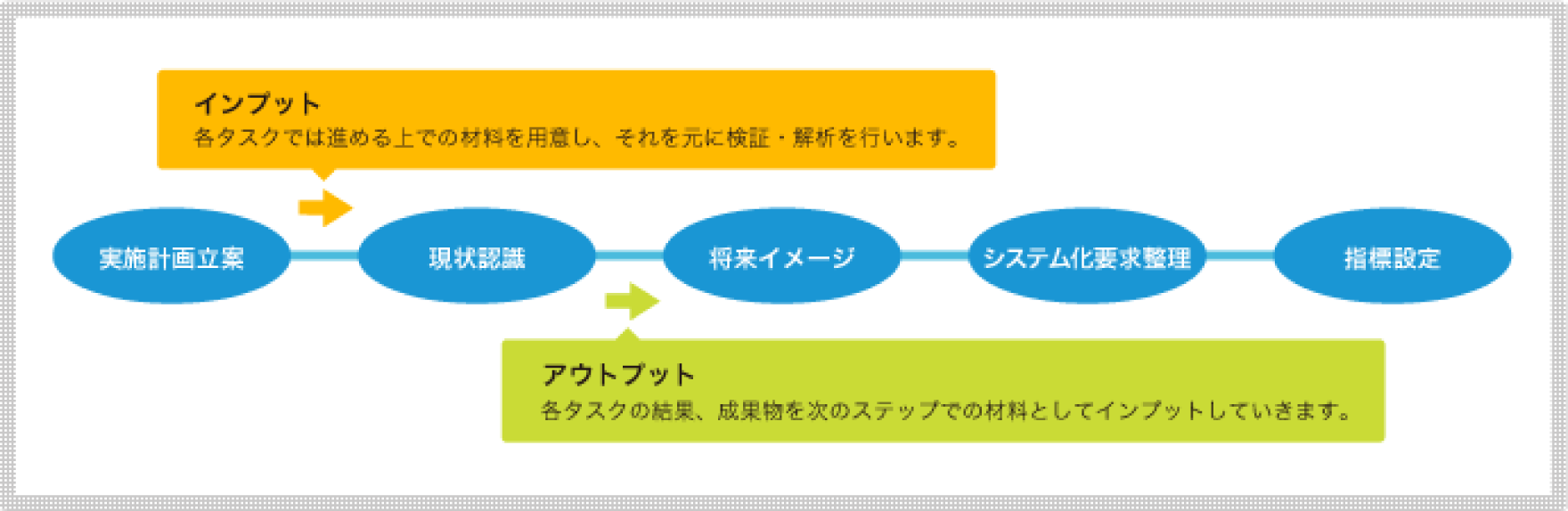 実施計画作成の作業タスクは明確なメソッド化がされています。各工程にはそのタスクが抱えるミッションをどのように解決していくかを定義付けした作業手順を用意しており、その手順にそって検討を行います。 その際、前タスクで創出された成果物を次タスクの材料にして段階的に検討を重ねていくことで明確かつ迅速に実施計画へと導きます。