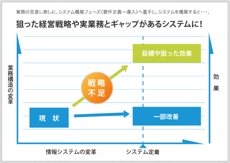 システム導入の際、業務の見直し無しにシステム構築を行うと、システム導入することが目的化してしまうことで戦略不足に陥り、狙った経営戦略と実業務とのギャップが生じてしまいます。その結果、導入される新システムは、業務の一部改善にとどまったり、現行システムの焼き直しとなってしまいます。