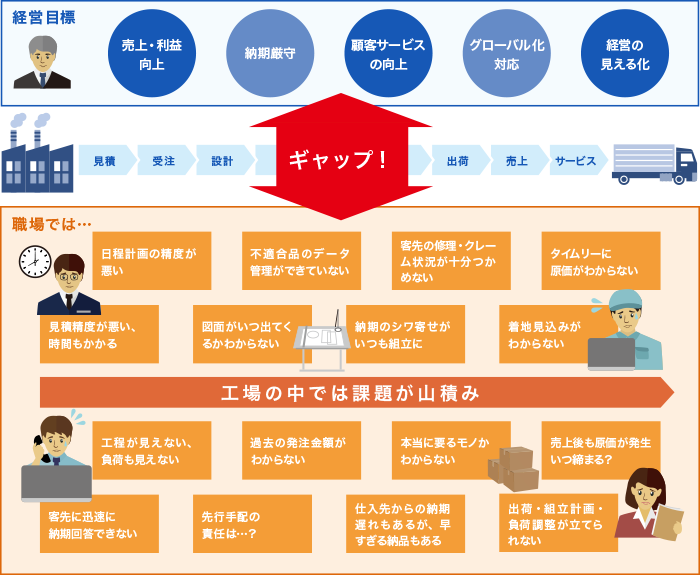 これらの3つの目的を達成するために、パッケージシステムを駆使し、どこまで貢献出来るのかと悩む以前に、現場では、それ以前の課題(図1)が山積みになっており、この経営者の思いとギャップがあることがほとんどです。