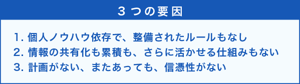 現場の課題を要約すると、「時間がかかる」「見えない、分からない」「精度が悪い」と、非効率で利益が出せない現場になってしまっています。現場の方によくよく話を聞いてみると、実はその要因というのは、大体以下の3つに集約できます。