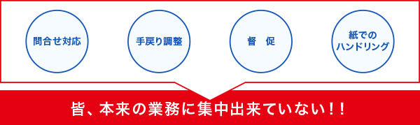 このような状況であり、問い合わせ対応、催促、調整、紙でのハンドリングなどに皆が手を取られ、 本来やるべき業務に時間が割けていない。さらにそれが本来の仕事だと錯覚している現場があるのも事実です