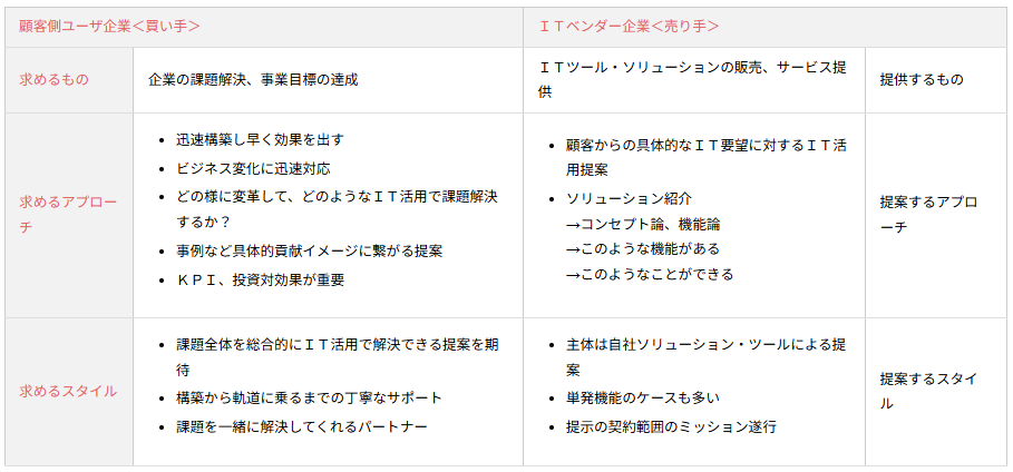 そこで買い手(顧客側)と売り手(ITベンダー側)の考え方とアプローチが異なることを理解し、それを念頭に対応する必要があると考えています。(詳しくは表1参照)