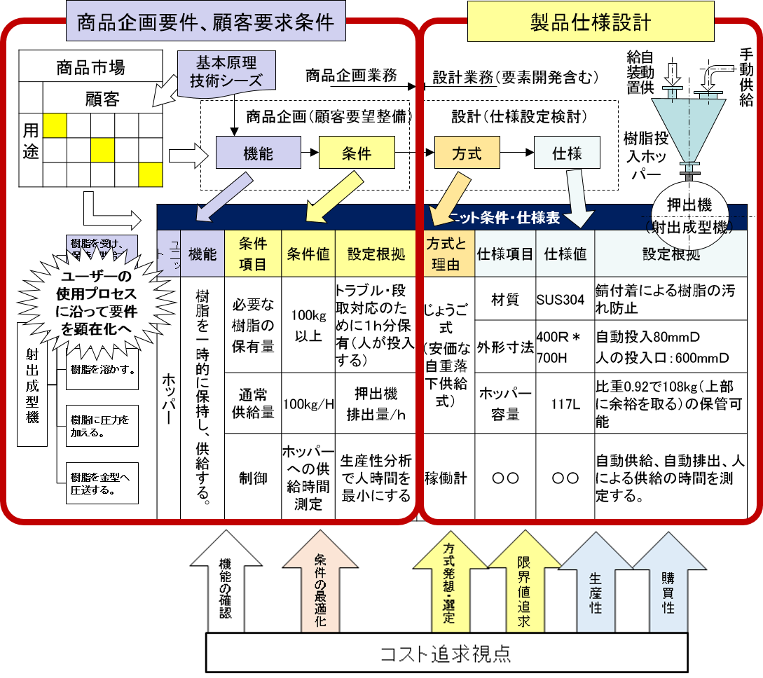 設計の前提条件は商品企画や個別受注における顧客要望機能・条件(要件)です。(下図左の領域) ここが適切に設定できないと、いくら設計が頑張っても売れる商品にはなりません。市場に立脚した情報を管理し、売れる商品の要件を詰めることが可視化の最初の作業です。良い製品設計のためには、顧客要望機能・条件とその根拠を残しておくことです。これをもとにマーケティング検証を行い、継続的に強い商品に育成していくべきです。また受注設計型製造業の営業部隊は、このシートを持ち左側の顧客要望を確認していくとよいでしょう。この要件の体系化とバリエーションのコントロールをしていくと量産効果につながるようになります。