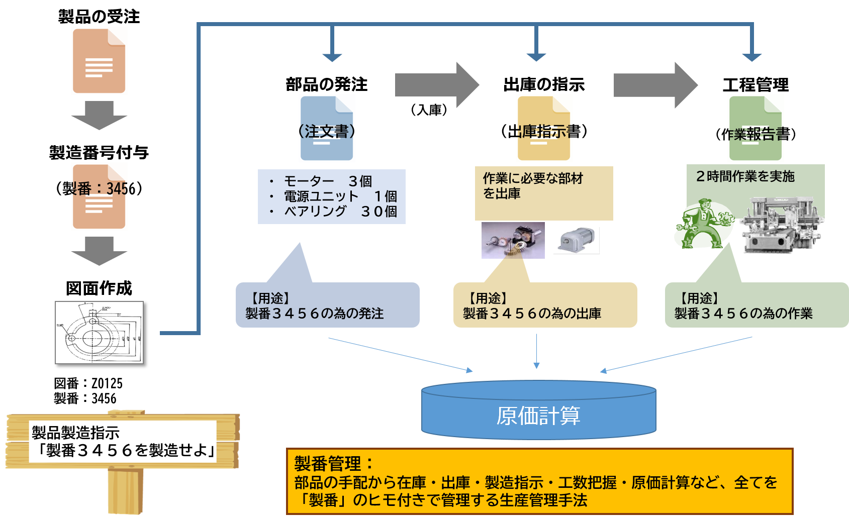製番管理方式とは、製造手配時に「製番」 と呼ばれる管理番号を設定し、計画・発注・出庫・作業指示から出庫までの全作業をこの製番で管理する仕組みです。