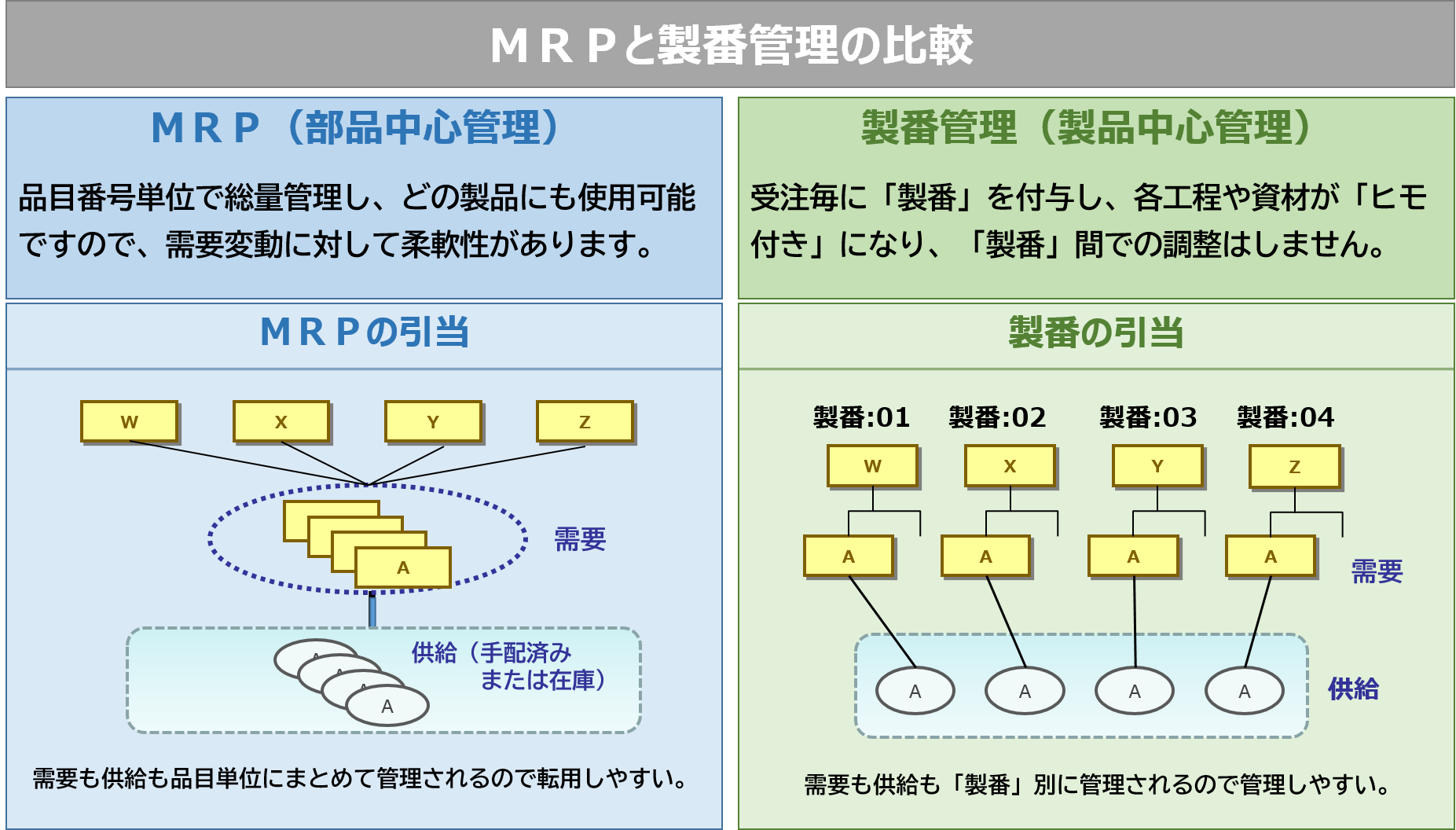 製番管理と比較される資材計画方式にMRP:Material Requirements Planning(資材所要量計画)と呼ばれるものがあります。夫々の特徴を以下にまとめておきます。