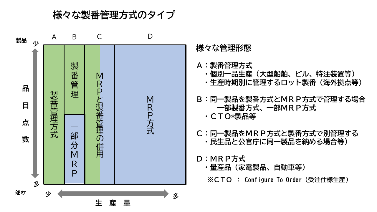 D)一般的なMRPによる部材の調達方式です。 製番管理といっても様々な管理方法があり、ひとつの会社でひとつの方式と言うわけではありません。 MRP方式と製番管理方式の両方の製品を持っている会社も少なくありませんが、夫々の方式にあった複数のシステムが必要なのでしょうか?