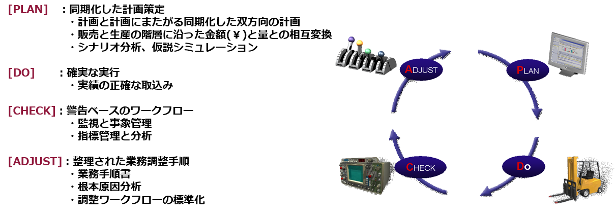 つまり、下図のような「計画 (Plan)」-「実行 (Do)」-「確認 (Check)」-「修正 (Adjust)」のループを高い頻度で回す、という考え方になります。この際、各プロセスでは次のような機能が必要になります。