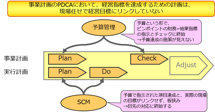 そもそも本来の SCM とは戦略的な経営管理手法であり、経営においては常にその重要な評価指標は量ではなく金額で管理されます。つまり、経営と唯一の予算達成ミッションを持つ営業部門における言語は「金額」であり、また生産や調達、物流などの実務部門の言語は「量」なのです。そのため、従来の SCM の取り組みにおいてはこれら2つの異なる言語の違いにより、企業としての一貫した PDCA の実現ができていなかったとも言えます。そのために、下図のように企業として1つの一貫した PDCA ループになり得ませんでした。