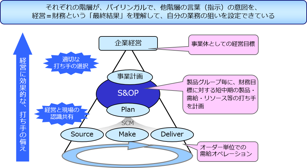 企業として一貫した1つの PDCA ループを実現し、新たなる課題を解決するための取り組みとして、S&OP (Sales & Operations Planning) という手法に注目が集まっています。これはその名前の通り、「金額」という言語を使用するSales (経営と営業部門)と 「量」という言語を使用する Operations (生産、調達、物流などの実務部門)を統合した計画の仕組みを意味します。S&OP の位置付けとしては、下図のように経営側と実務側を繋ぐための仕組みとなります。