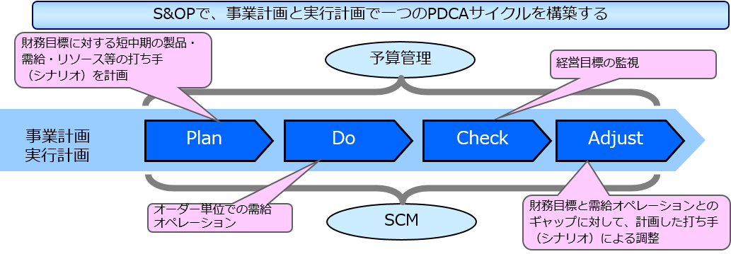 そしてこの S&OP の仕組みにより、前述の ループになっていなかった PDCA を、下図のように一つのループとして作り上げるものです。