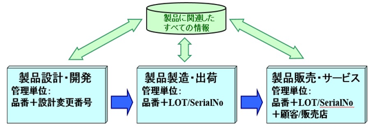 ③関連付された情報の結束:設計開発時の設計変更履歴から、試験結果、製造履歴(含む変更点)、 販売後の製品の使用状況まで製品の生涯を串刺しして見える化