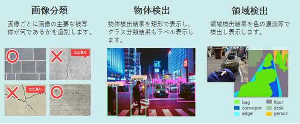 二つ目は、まさに見て分かる画像の解析による見える化です。下の図にあるような判断を伴う画像分類、識別能力を生かした物体や領域の検出などが挙げられます。このような画像の分析や画像の加工を応用した見える化は目視検査の自動化など工場においてもいろいろな分野への適用が期待されます。