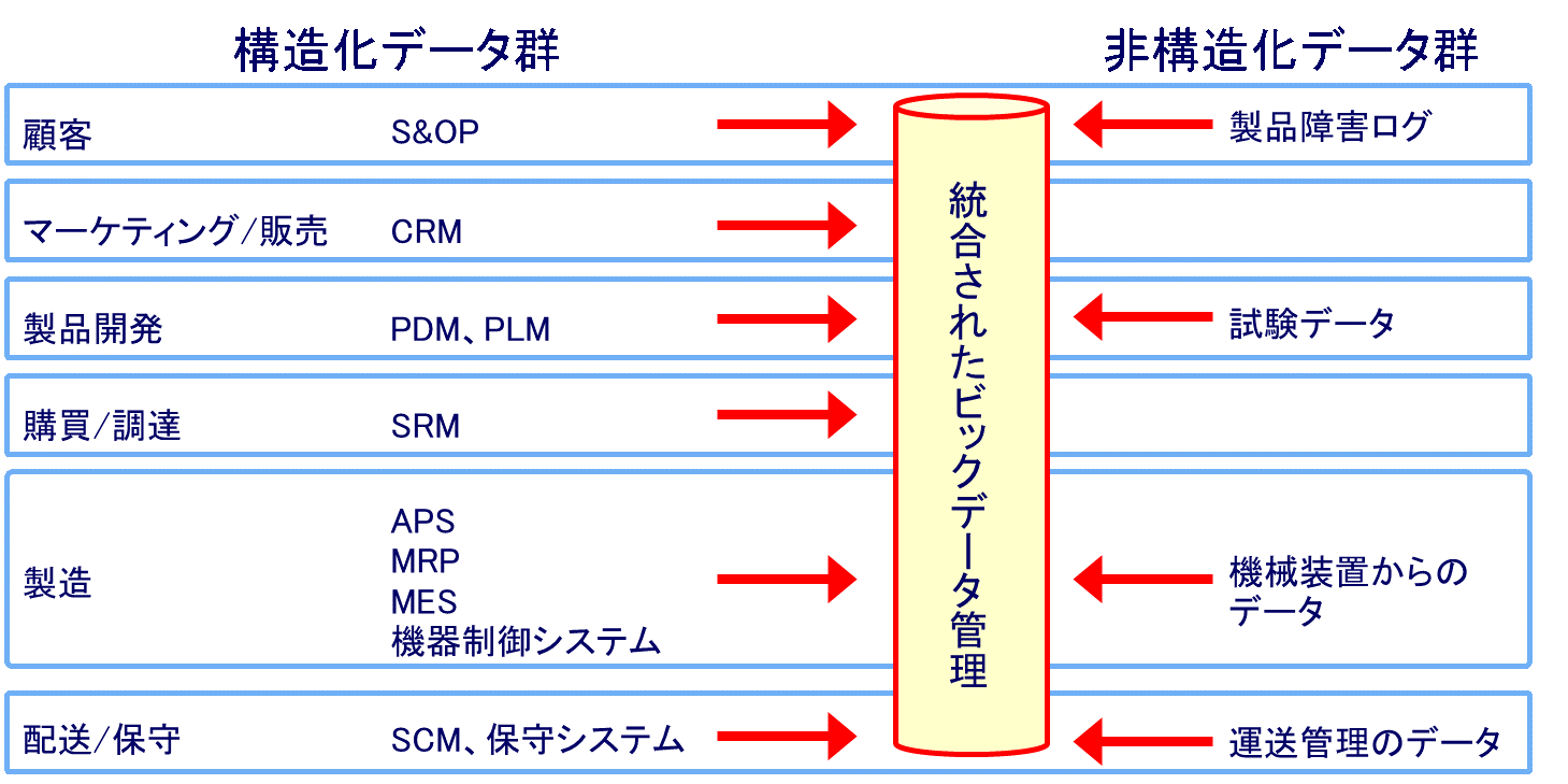 一方、部品・製品の開発設計情報、生産情報、市場情報を有機的に紐づけ、意図に沿った情報の設計を人がやるということは中々手間のかかることです。 データのラベリングをしてタグ情報を基にデータモデルの設計をしなければなりません。 各データ群は各々のデータフォーマットを持っており変換が迫られることも一般的です。 図に示すように、構造化データに関しては、各々のシステムツールにより限られた領域でのデータは管理できますが、上流から下流までの垂直統合されたデータ管理は難しいと言えます。 さらに、シリーズ1第2回で紹介した構造化データと非構造化データの仮想統合も求められその難易度が増しています。